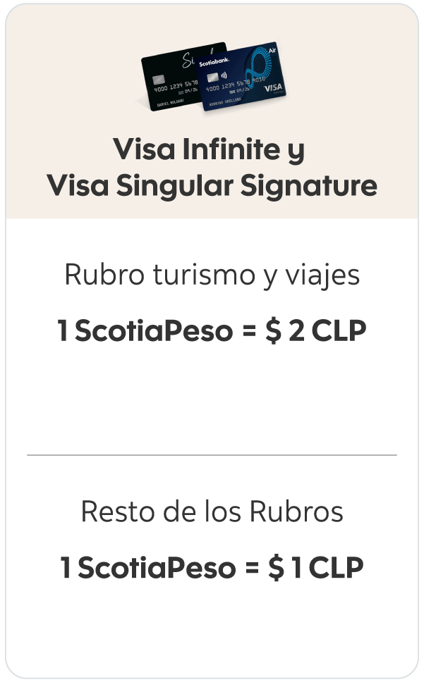 Con tus Tarjetas de Crédito Mastercard Black, Visa Signature, Visa Infinite, Visa Singular Signature, Visa Infinite Singular y Visa Singular Infinite acumulas 0,7% del monto de tu compra. Y si recibes el abono de tu sueldo en tu cuenta corriente Scotia, acumulas un 50% adicional, acumulando 1,05% del monto de tu compra.